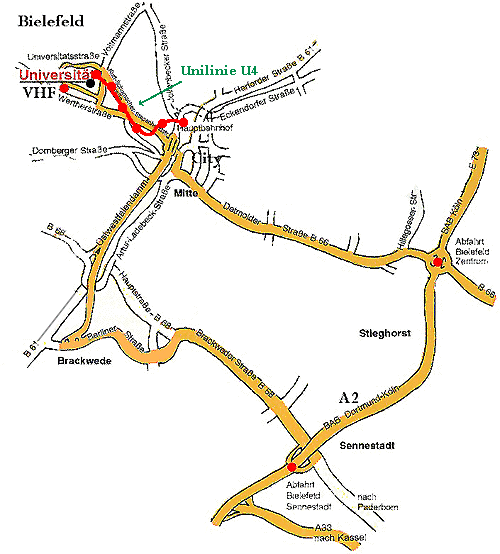 Mit öffentlichen Verkehrsmitteln: U-Bahn Linie 4 (z. B. ab Bielefeld Hbf) bis direkt zur Uni - einfacher geht's nicht.