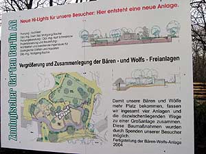 Neben den Felsanlagen für die Tropenbären entstehen gegenwärtig große natürlich gestaltete Anlagen für die Kragenbären (und der Kultkatze Muschi), die Braunbären und die Wölfe. Zu Ostern, spätestens doch zu Pfingsten soll die Eröffnung sein. Man darf gespannt sein, wie sich die Bären mit den Wölfen vertragen. |