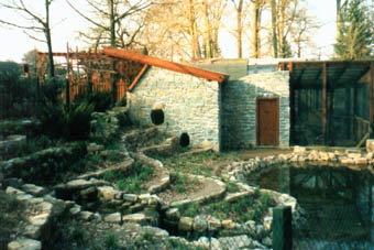 Durchführung:In mehreren Besprechungen mit der Tierparkleitung wurde uns zugesichert, daß das von uns vorgestellte Konzept verwirklicht werden soll. Allerdings ergaben sich in der praktischen Umsetzung der Pläne einige Probleme. Verwirklicht wurden nach unseren Ideen Wasserlauf und Teich mit Freisichtstelle, ein einsehbares Innenhaus und die Verkleidung des alten Wolfshauses mit Natursteinen. Leider wurde dabei wenig auf naturnahe Gestaltung geachtet. Die Natursteinwand ist streng senkrecht und fugenfrei gemauert, der Teich weitgehend vegetationsfrei (statt unserer Wasserpflanzen- und Schilfzone), die Sträucher entsprechen nicht dem Lebensraum (Beerensträucher), die Terrassierung des Hanges ist geometrisch, das Innenhaus ist mit einer Pergola vorgebaut, wo wir eine Höhle unter einem Baum darstellen wollten. Eine nachträgliche Verkleidungsaktion der Zoo-AG mit Altholz verdeckte zwar das Schlimmste, konnte aber den gewünschten Natur-Effekt leider nicht erzielen und wurde zwischenzeitlich wieder entfernt. Auch die große Informationstafel wurde nur provisorisch aufgestellt, nicht dauerhaft gestaltet und ist mittlerweile wieder verschwunden. |