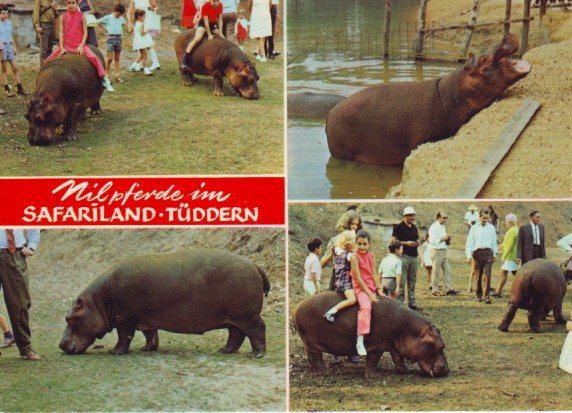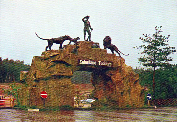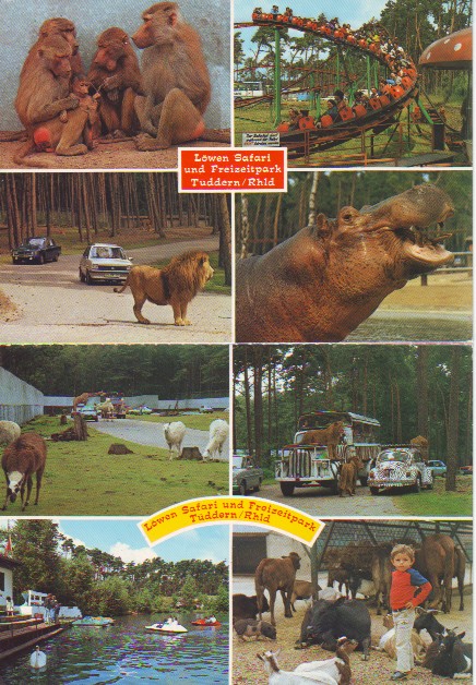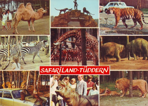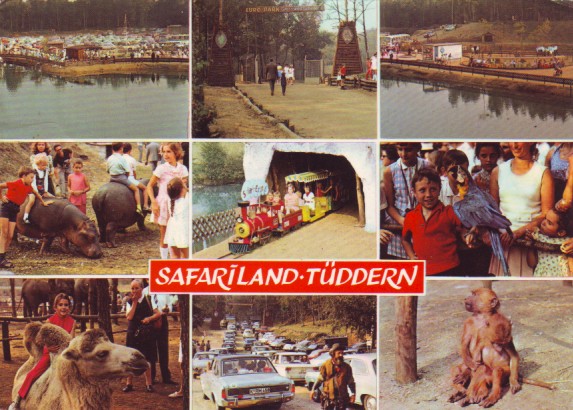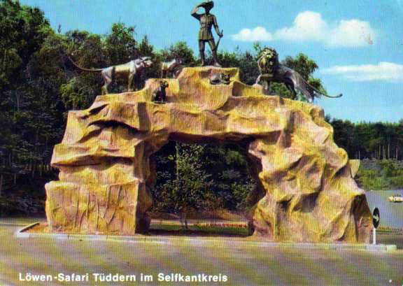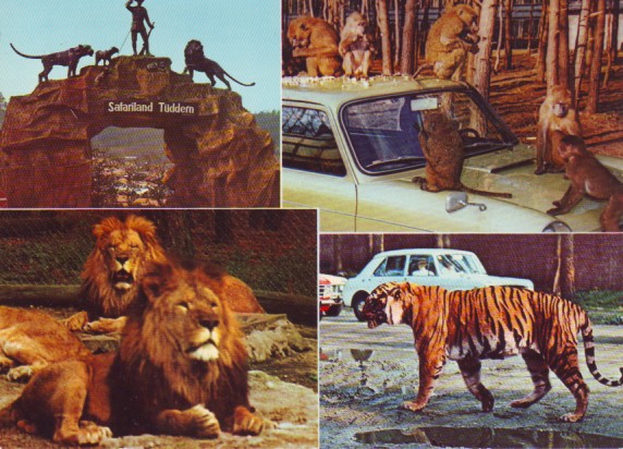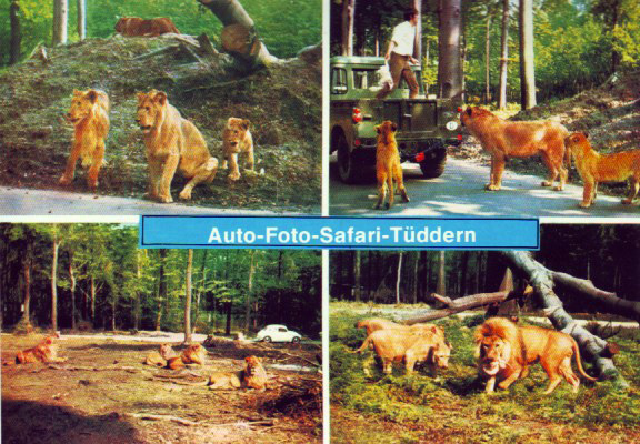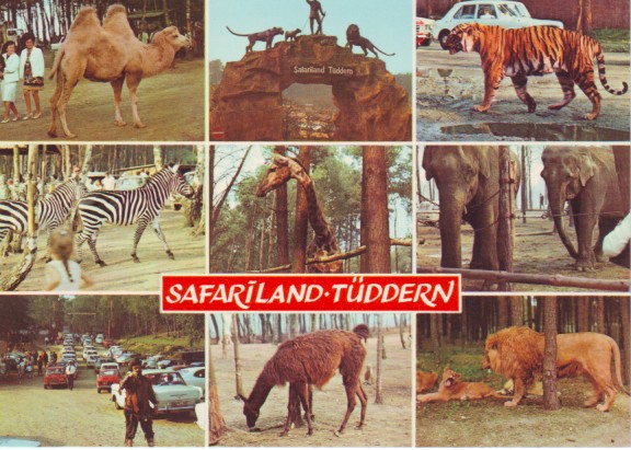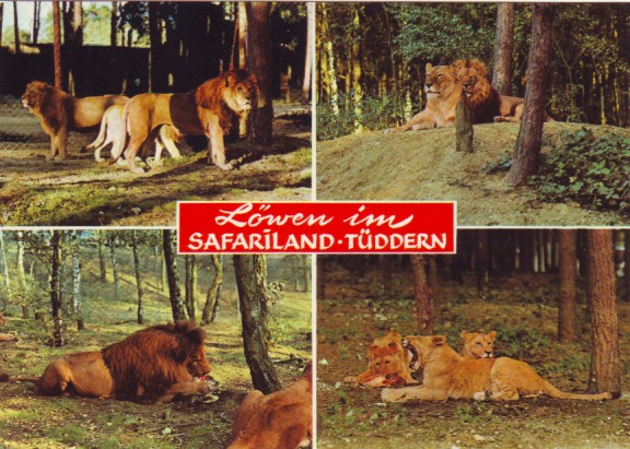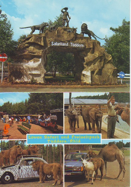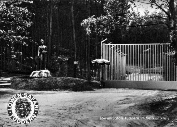 Löwensafari Tüddern † bei Selfkant: 31. Mai 1968 als erster Safaripark Deutschlands eröffnet (Betreiber: Dompteur und Artist Hans Rosenberg aus dem benachbarten Süsterseel, zusammen mit dem Bildhauer und Puppenfilm-Fabrikant Richard Schmidt und dem Schausteller Gottlieb Löffelhardt)(Bericht aus dem Eröffnungsjahr). Recht klein (offiziell 70 ha, aber nie voll ausgebaut, max. 35 ha genutzt inkl. Parkplätzen und See), bei Eröffnung 32 Löwen, bot neben einigen Safarigehegen (Löwen, Tiger, Paviane - später zur Savanne umgebaut) und dem "Daktari-Land" (klassischer Tierpark-Bereich mit Gehege- und Käfigansammlung, hier auch zeitweise junge Elefanten , Flusspferde und Schimpansen) hauptsächlich eine Westernstadt mit einfachen Freizeitattraktionen. Schmidt und Löffelhardt hatten 1967 auch das Phantasialand (damals noch Märchenwald) gegründet und stiegen 1969 aus dem Safaripark aus, um sich ganz dem Freizeitpark widmen zu können. Anfangs durch Rosenberg + Althoff betrieben, in den 70ern durch Familie Weinheimer übernommen und renoviert. 1985 starb der langjährige Direktor Johann Weinheimer im Alter von 68 Jahren. Danach wurden immer mehr Tiere verkauft und der Park zunehmend ungepflegt. Der Umbau ab 1988 zu Fuß-Safari und Affenland scheiterte, 1990 war der Park pleite und wurde geschlossen, Artikel. Teiles des Geländes (Eingang, Parkplatz, Teich, Restaurant, fußläufige Bereiche) sind heute durch Sandabbau abgebaggert, ab 2018 soll das Gelände renaturiert und zum Naherholungsgebiet werden. (1986 besucht, 2006 Gelände besichtigt) - s. Bilder unten und alte Filmdokumente im Youtube-Kanal von Tristian.